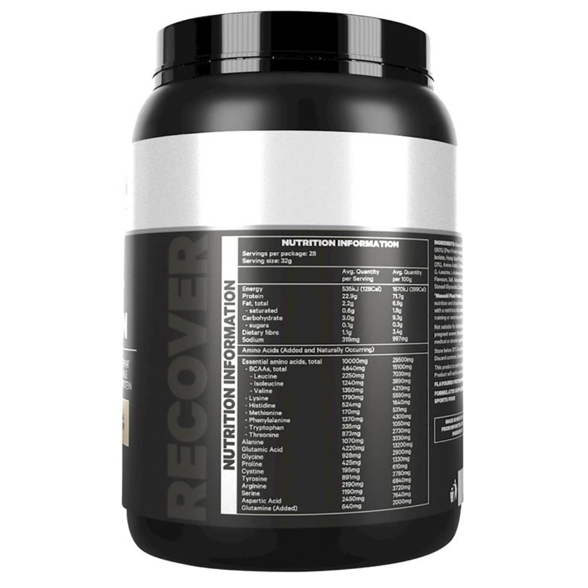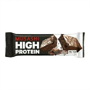 Hỗn hợp protein thực vật Musashi (86%) [Protein hạt đậu (82%), Protein gạo lứt cô đặc (3%), Protein chia (0,5%)], Hương vị tự nhiên, Sợi ngô hòa tan (3%), Bột ca cao, Axit amin [L-Glutamine (2%), BCAAs (1%) (L-Leucine, L-Isoleucine, L-Valine)], Bột Triglyceride Chuỗi Trung bình (MCT) (0,5%), Muối, Chất làm ngọt tự nhiên (Thaumatin, Steviol Glycoside ), Enzyme (0,2%) (Papain).
