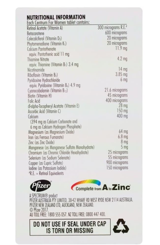 Hướng dẫn : Người lớn uống một viên Centrum for Women mỗi ngày với nước. Không vượt quá liều khuyến cáo hàng ngày.