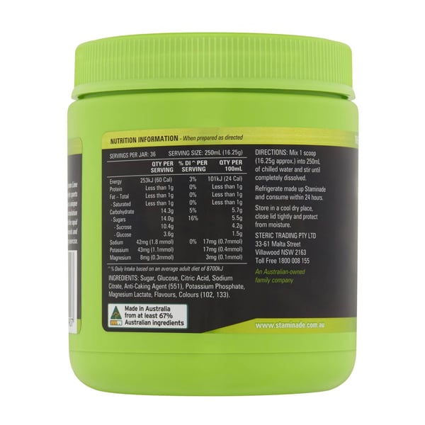 Staminade Lemon Lime Powder là bột pha nước uống vị chanh hỗ trợ tăng năng lượng đang rất được ưa chuộng tại Úc. Staminade là chuyên gia dinh dưỡng trong lĩnh vực thức uống năng lượng thể thao, với công thức đặc biệt duy nhất giúp dập tắt cơn khát, bổ sung Carbonhydrate, Magnesium và chất điện giải bị hao hụt trong quá trình vận động cũng như thi đấu một cách nhanh chóng và hiệu quả tức thì, giúp các vận động viên cải thiện được thể lực và thi đấu đạt thành tích cao cho tất cả các môn thể thao.