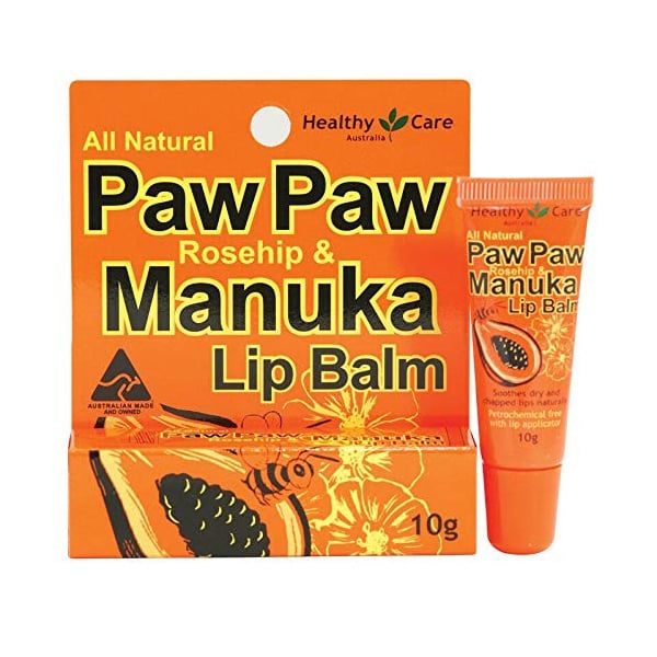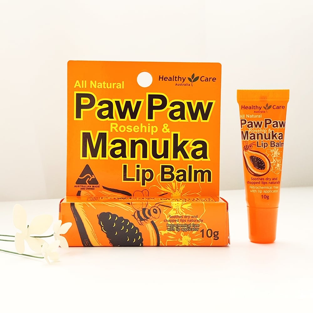 Healthy Care Paw Paw Rosehip & Manuka Lip Balm chiết xuất từ đu đủ, mật ong Manuka giàu chất làm mềm, các loại Dầu và Bơ trong công thức sẽ giúp bảo vệ đôi môi khỏi bị khô quá mức (dầu hướng dương, dầu thầu dầu, dầu tầm xuân, ca cao, bơ hạt mỡ).