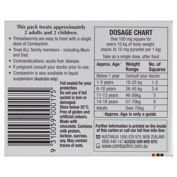 Thành phần kẹo tẩy giun vị socola Combantrin Chocolate Squares của Úc 24 miếng: