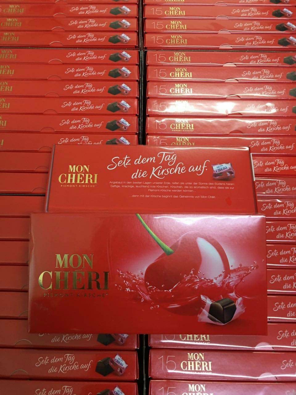 🍒 Mon Cheri tiếng Pháp là “tình yêu của tôi”, được sản xuất từ năm 1956, lần đầu tiên được giới thiệu ở Pháp, Bỉ, Đức và Vương quốc Anh. Tên gọi “Mon Cheri” đã được thông qua nhanh chóng và trở thành tên thương hiệu cho thị trường quốc tế.