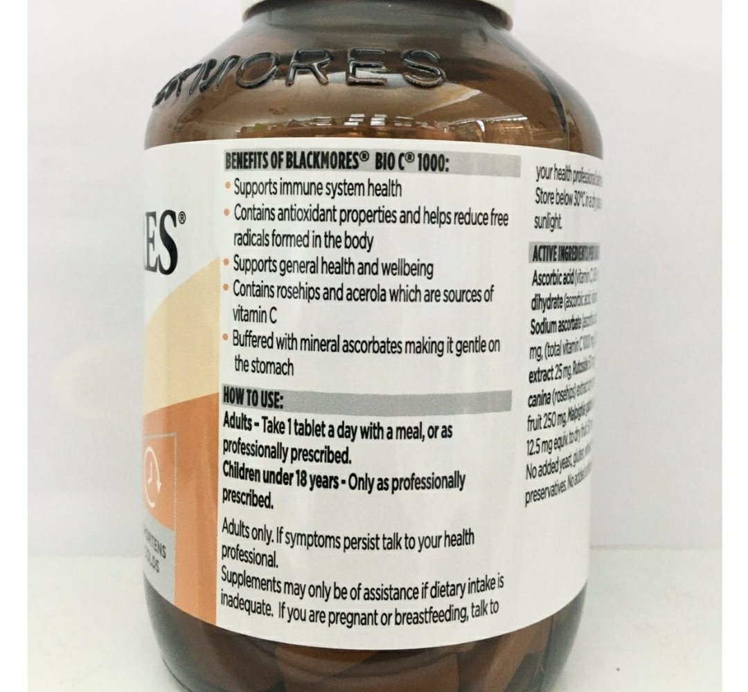 Vitamin C là thành phần dinh dưỡng vô cùng quan trọng. Nó không chỉ có ảnh hưởng trực tiếp đến hệ thống miễn dịch của cơ thể, mà còn tham gia vào rất nhiều quá trình trao đổi chất, hấp thụ khoáng chất. Viên uống bổ sung vitamin C Blackmores Bio C 1000mg là giải pháp lý tưởng bổ sung vitamin C hàm lượng cao, giúp bảo vệ sức khỏe. Sản phẩm cung cấp 1000mg vitamin C được tối ưu khả năng hấp thu vào cơ thể để giúp tăng cường sức khỏe, phòng ngừa bệnh cảm cúm. Sản phẩm của Úc đạt tiêu chuẩn nghiêm ngặt về chất lượng, đang được ưa chuộng trên thị trường.