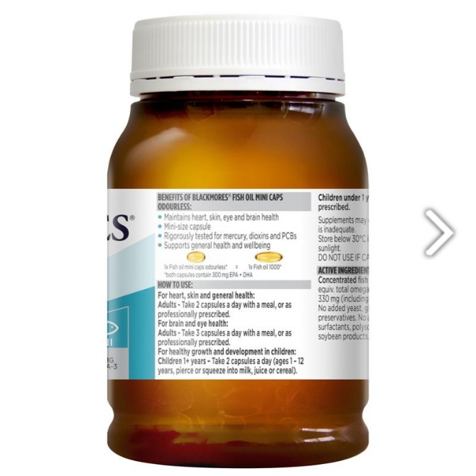 có kích thước bằng một nửa viên Blackmores Odourless Fish Oil 1000mg thông thường dễ sử dụng và không còn mùi tanh gây cảm giác khó chịu khi uống trong khi hàm lượng các chất vẫn đầy đủ. Sản phẩm giúp hỗ trợ bổ sung omega-3 triglycerides EPA và DHA cho cơ thể.