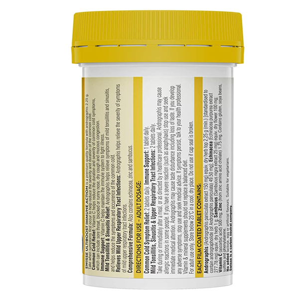 Swisse Ultiboost Immune Action với công thức chất lượng cao có chứa chiết xuất andrographis tiêu chuẩn, thảo dược, vitamin và khoáng chất, hỗ trợ tăng đề kháng, làm giảm tình trạng viêm họng, viêm amidan, viêm xoang.