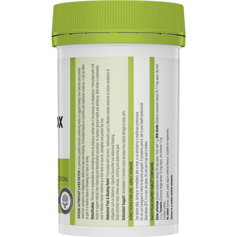 Swisse Ultiboost Liver Detox là sản phẩm viên uống được điều chế với công thức chứa cây kế sữa, theo truyền thống được sử dụng như một loại thảo dược để giúp hỗ trợ và bảo vệ sức khỏe gan và hỗ trợ quá trình tái tạo của các tế bào gan. Atiso cũng được đưa vào thành phần để giúp làm giảm chứng khó tiêu và đầy hơi. Công thức cũng chứa bột nghệ, giúp chống viêm và ngăn ngừa những hư tổn tiềm tàng đối với chức năng gan.
