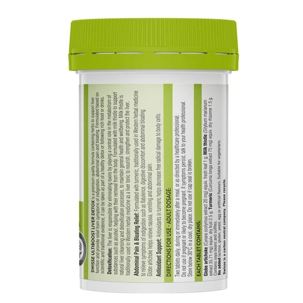 Swisse Ultiboost Liver Detox là sản phẩm viên uống được điều chế với công thức chứa cây kế sữa, theo truyền thống được sử dụng như một loại thảo dược để giúp hỗ trợ và bảo vệ sức khỏe gan và hỗ trợ quá trình tái tạo của các tế bào gan. Atiso cũng được đưa vào thành phần để giúp làm giảm chứng khó tiêu và đầy hơi. Công thức cũng chứa bột nghệ, giúp chống viêm và ngăn ngừa những hư tổn tiềm tàng đối với chức năng gan.