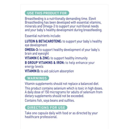 Cho con bú là một trong những thời kỳ dinh dưỡng khó khăn nhất trong cuộc sống của một người phụ nữ. Trong giai đoạn này, người mẹ đòi hỏi một nhu cầu dinh dưỡng cao không kém giai đoạn mang thai, và việc ăn uống hàng ngày không thể đáp ứng đủ chất dinh dưỡng cho người mẹ sau khi sinh. Ngoài ra, vì do bận rộn việc chăm sóc em bé, các bà mẹ thường không có nhiều thời gian lo cho việc ăn uống đầy đủ chất dinh dưỡng cho mình. Do đó sản phẩm Elevit Breastfeeding đã được điều chế theo một công thức đặc biệt nhằm cung cấp đầy đủ các loại vitamin, khoáng chất và Omega 3 cho cả mẹ và cả em bé trong giai đoạn này, đặc biệt các cơ quan như: não bộ, thị lực, năng lượng và khả năng miễn dịch.