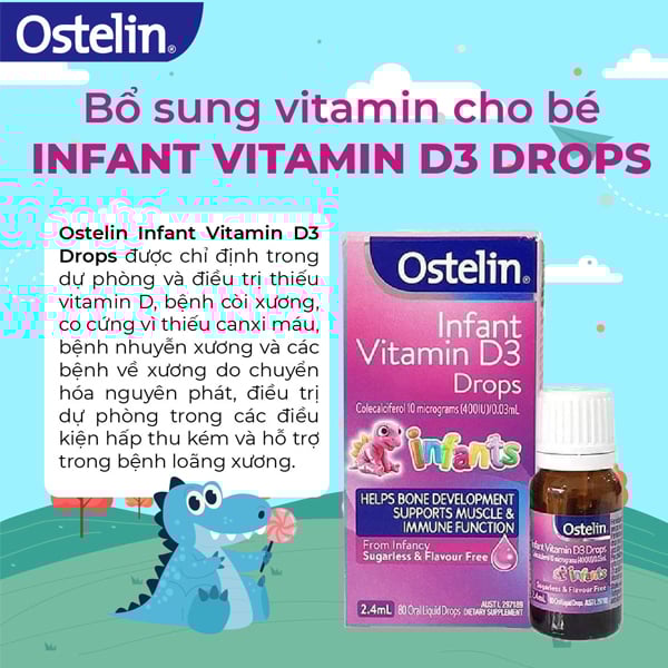 Ostelin Infant Vitamin D3 Drops (2.4ml dùng trong 80 ngày) cho trẻ là dòng sản phẩm được ưa chuộng sản xuất tại Úc sẽ giúp bé được bổ sung đầy đủ hàm lượng vitamin cần thiết mỗi ngày.