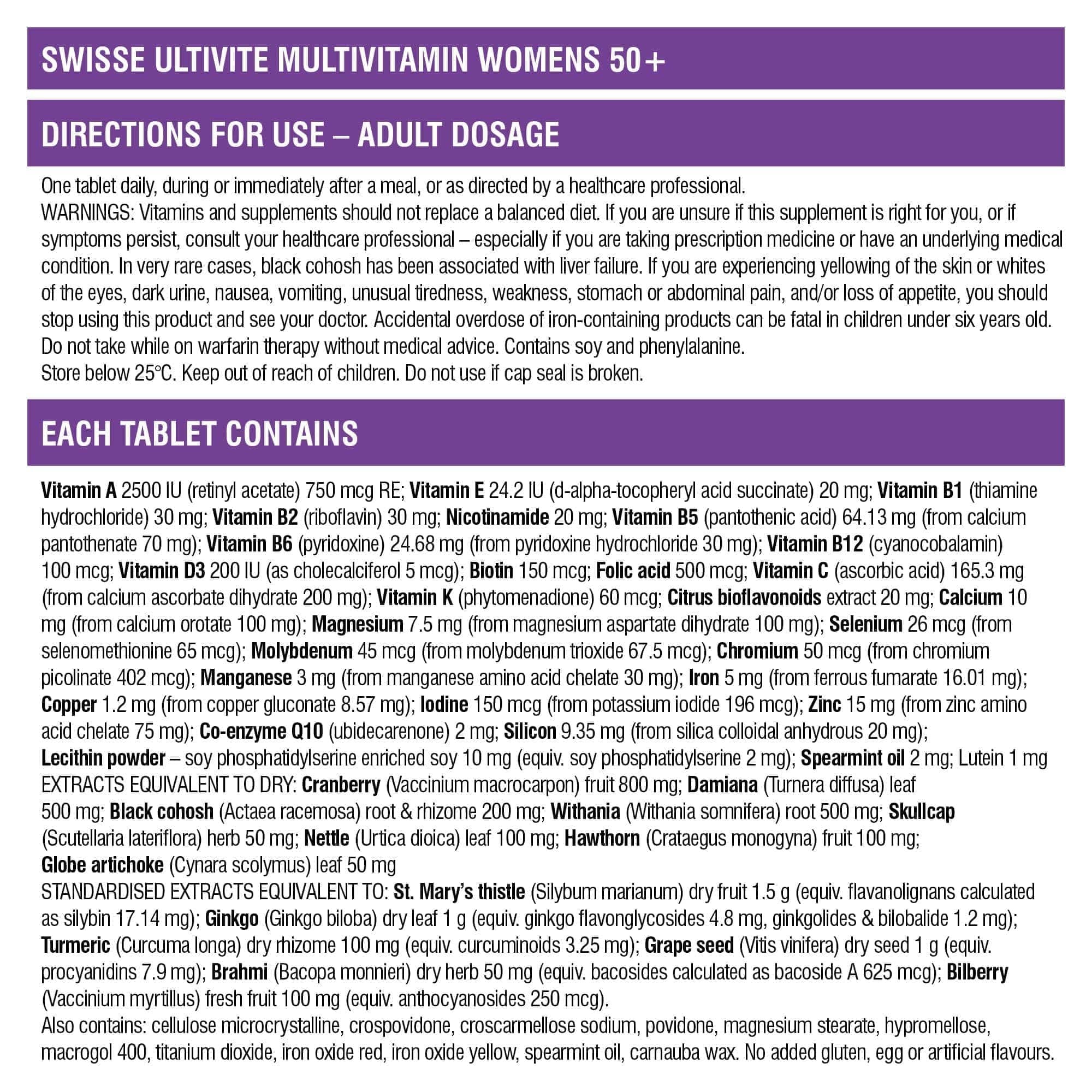 Thành phần vitamin tổng hợp cho nữ trên 50 tuổi Swisse Ultivite Women’s 50+ Multivitamin của Úc 60 viên: